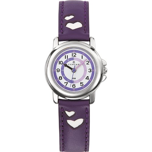 Montre CERTUS Cuir . Montre CERTUS Fille, Quartz, Boîtier rond Acier, fond blanc, Bracelet Cuir violet, coeurs ...
