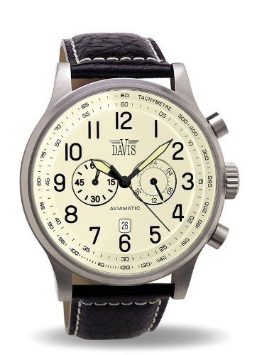 Die Davis 0454-Montre Aviateur Homme Vintage 48mm-Cadran Beige-Chronographe Etanche 50M-Date-Bracelet Cuir Noir Details